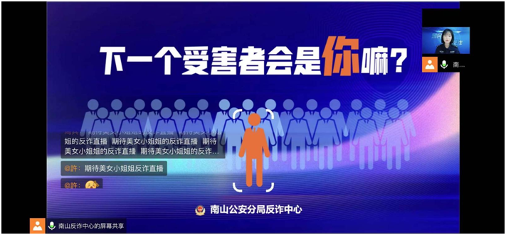 为深入贯彻中央、省、市关于打击治理网络新型违法犯罪工作的精神,增强我校师生对电信诈骗犯罪的识别能力和应对能力,我校特邀请南山公安反诈中心于5月12日晚19:00开展网络直播讲座。讲座由陈慧警官主讲,我校一百余名师生积极参与。